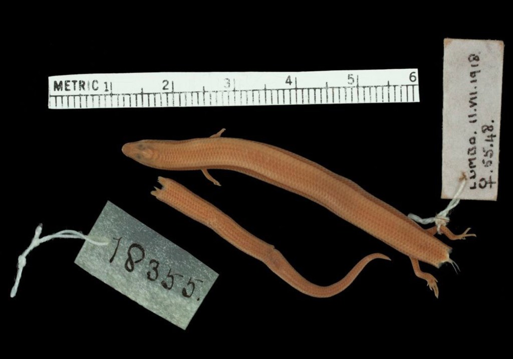 The skinks Scolecoseps boulengeri and Proscelotes aenea are two of the most mysterious skinks in East Africa. They were both collected in two cities of Mozambique (Pemba and Lumbo) in the early 20th century in high numbers with very low sampling effort.