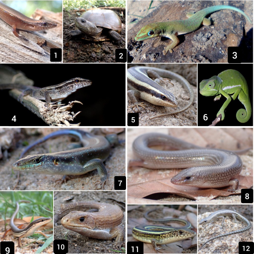 - Panaspis whalbergii, 2. Pelusius sinuatus, 3. Phelsuma dubia, 4. Lygodactylus grotei, 5. Trachylepis striata, 6. Chamaeleo dilepis, 7. Trachylepis margaritifera, 8. Sepsina tetradactyla, 9. Tracylepis megalura, 10. Gerrhosaurus intermedius, 11. Gerrhosaurus intermedius, 12. Cryptoblepharus africanus