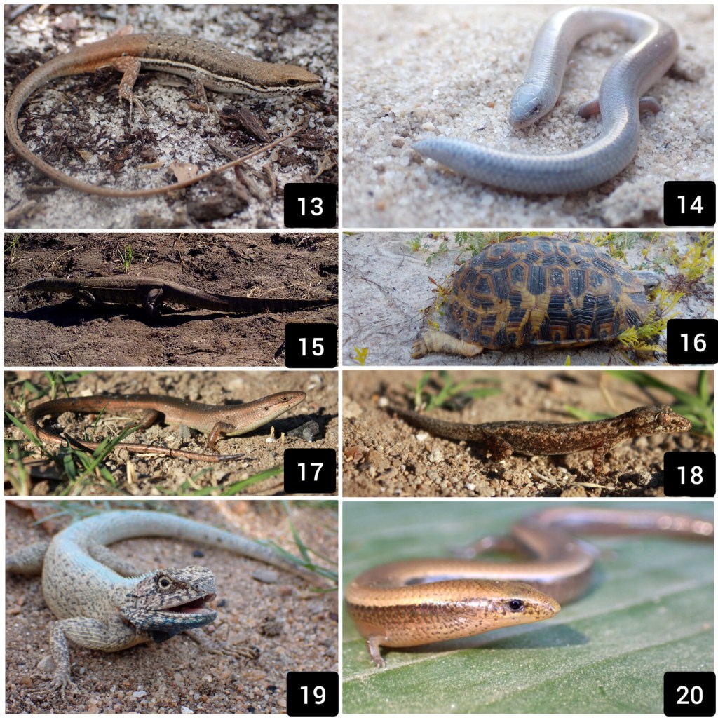 13. Trachylepis varia, 14. Sepsina tetradactyla, 15. Varanus niloticus, 16. Kinyxis zombensis, 17. Trachylepis boulengeri, 18. Hemidacylus mabouia, 19. Agama mossambica, 20. Proscelotes aenea