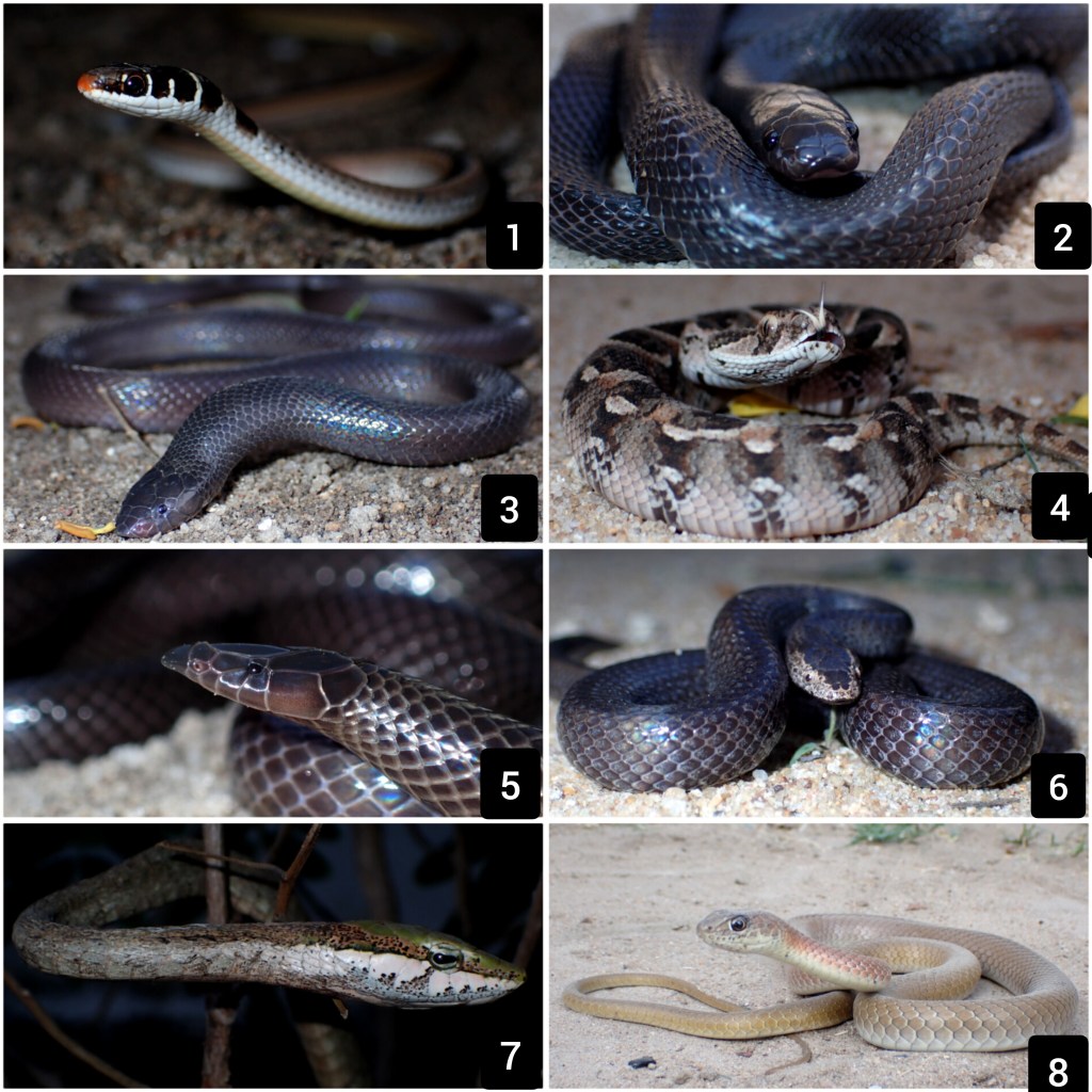 - Psammophis angolensis, 2. Gracililima nyassae, 3. Atractaspis bibroni, 4. Bitis arientans, 5. Xenocalamus sp, 6. Lycophidion nanum, 7. Thelotornis mossambicanus, 8. Psammophis mossambicus