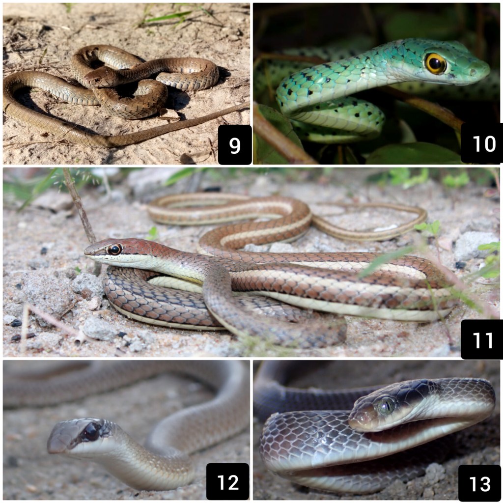 9. Naja mossambica, 10. Philothamnus semivariegatus, 11. Psammophis orientalis, 12. Ramphiophis rostratus, 13. Crotaphopeltis hotamboeia
