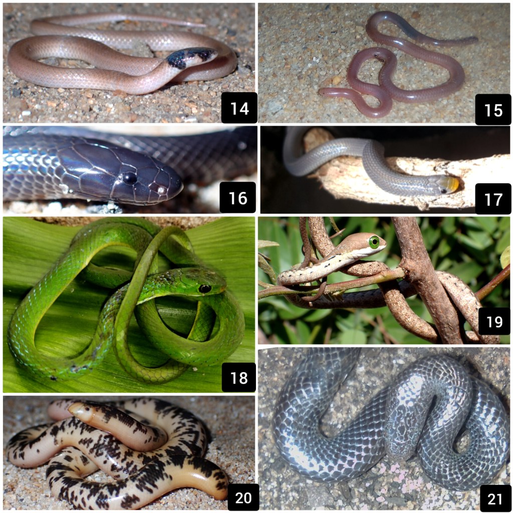 14. Aparallactus capensis, 15. Myriopholis longicauda, 16. Amblyodipsas polylepis, 17. Prosymna sthulmani, 18. Philothamnus hoplogaster, 19. Dispholidus typus, 20. Afrotyphlops mucroso, 21. Lycophidion capensis